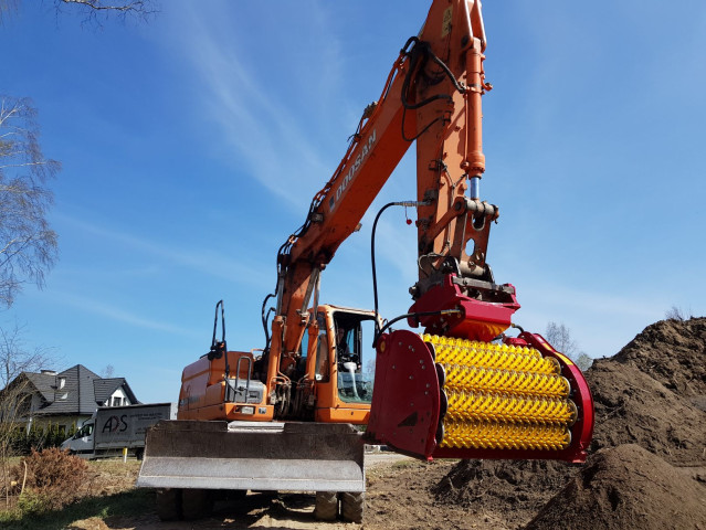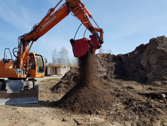 Łyżka przesiewająca LLOYD RS10-20, produkowana w Anglii, przesiewa materiał poprzez obracanie się wałków z gwiazdkami ze specjalnego tworzywa, końcowa granulacja materiału ok. 2 cm. Sprawdza się przy przesiewaniu humusu, ziemi, gruzu, kamieni i innych materiałów.
