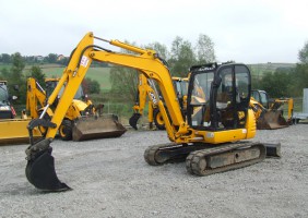 Koparka gąsienicowa JCB 8052 z kabiną zamkniętą i ogrzewaną. Waga: 5200 kg, gąsienice gumowe, lemiesz spycharkowy, dwie prędkości jazdy (wolna/szybka), używane mechaniczne szybkozłącze koparkowe JCB, instalacja hydrauliczna, pełne oświetlenie robocze, używana łyżka koparkowa, radio, długie ramię kopiące 1900mm.