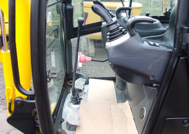 Koparka gąsienicowa JCB 801.6 z ogrzewaną kabiną zamkniętą, gąsienice gumowe, lemiesz spycharkowy, instalacja hydrauliczna, dwie łyżki koparkowe w komplecie, dodatkowe oświetlenie robocze.